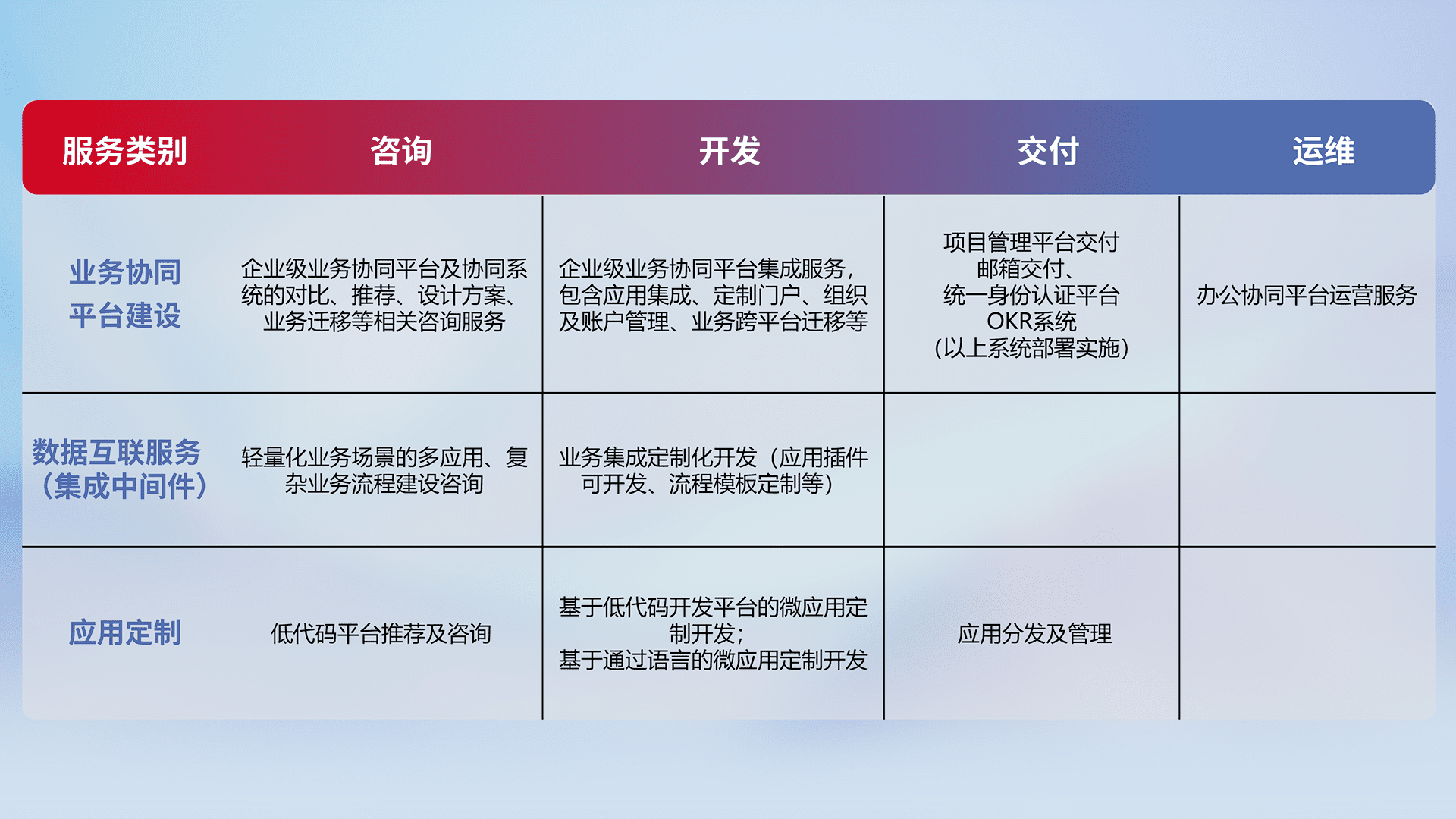 针对钉钉、、、企微、、、IDaas等平台级产品提供产品的规划、、、、方案、、、交付、、定制化开发等服务,,实现如统一协同办公、、、、智能客户服务、、、混合会议管理、、智能数据查询、、等业务场景,,,实现数字化转型。。。