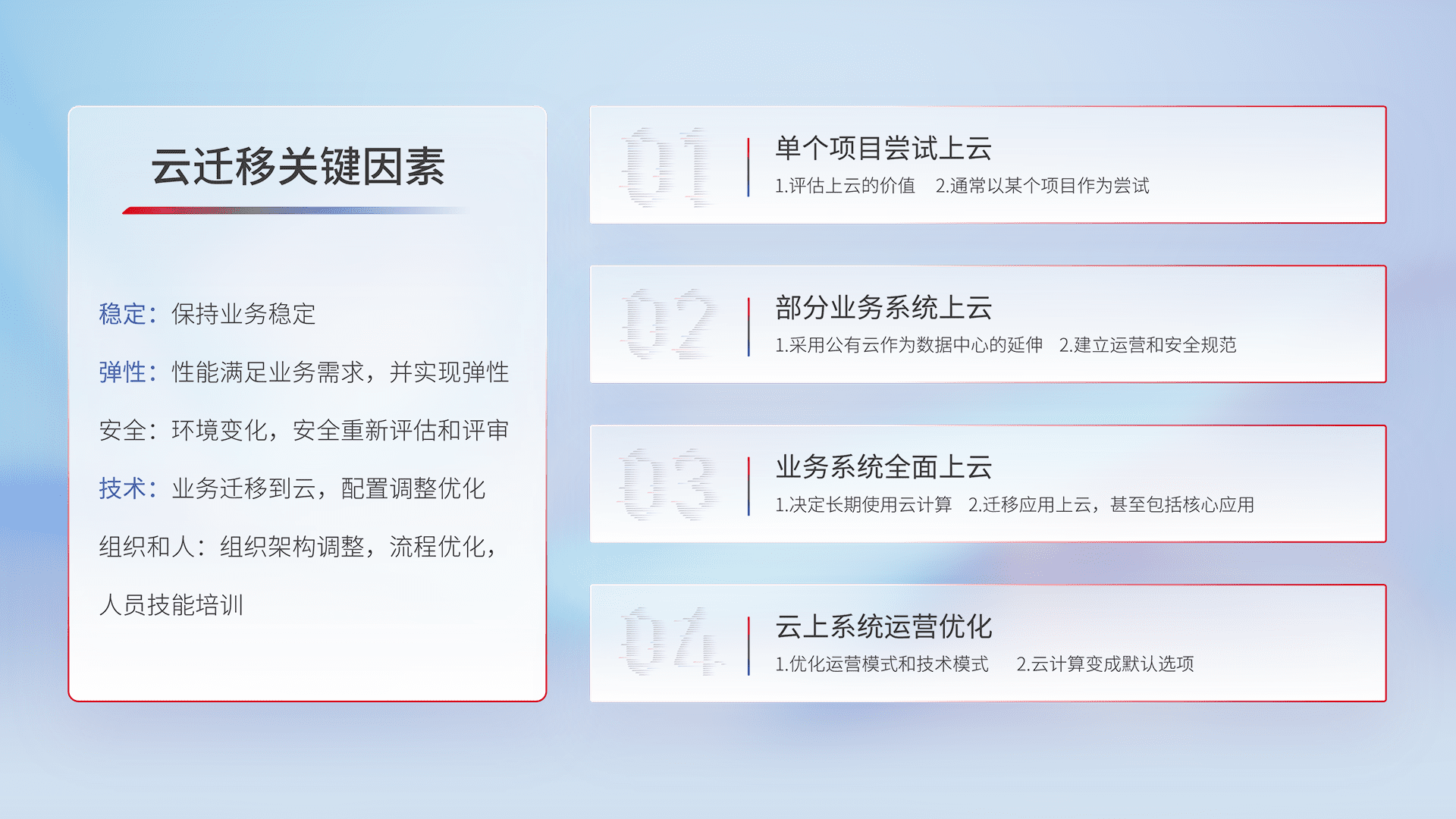 结合实际业务,,从规划设计、、、、云平台选型、、云原生改造、、数据迁移、、、集成交付,,,迁移全过程为客户识别最佳上云路径,,做好风险识别管理,,,,设计网络架构、、、身份权限、、、安全审计合规、、、、操作审计、、日志审计、、、、监控告警策略、、、多站点容灾设计等,,,对云上基础设施进行整体规划,,,提升IT治理水平,,,,以满足弹性、、、高可用、、高性能的需求。。。。