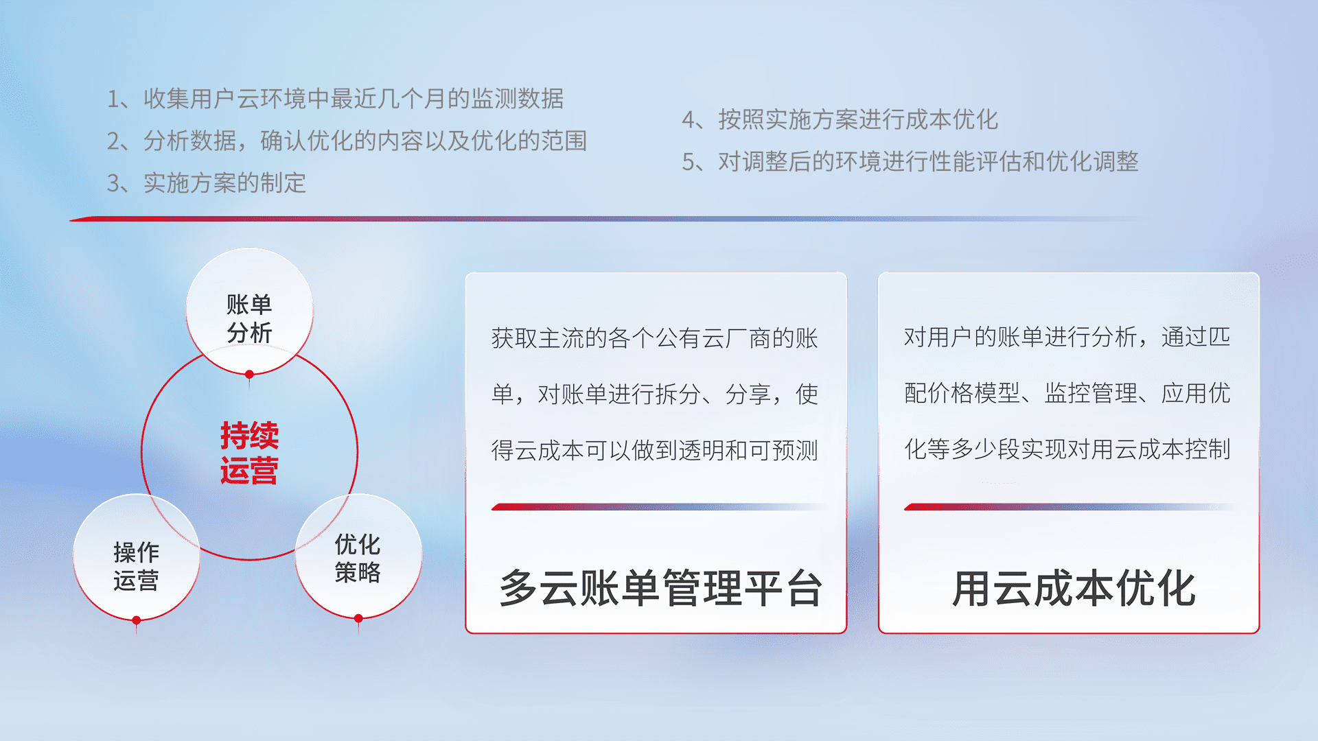 通过灵活运用多种自动化迁移工具,,帮助企业用户实现业务和数据高效 、、稳定的上云迁移和云上迁移,,,,采用自研多云纳管平台,,以中立管理模式,,,解决多组织、、、、多云、、、多运维厂商的复杂关系的管理,,,保证多云平台资源配置的一致性,,,实时掌控云资源运行数据,,,运用智能化工具分析云资源多云平台的管理服务,,,透明化管理成本支出,,,用云成本可预测、、用云费用可优化、、、云资源配额有据可依。。。。