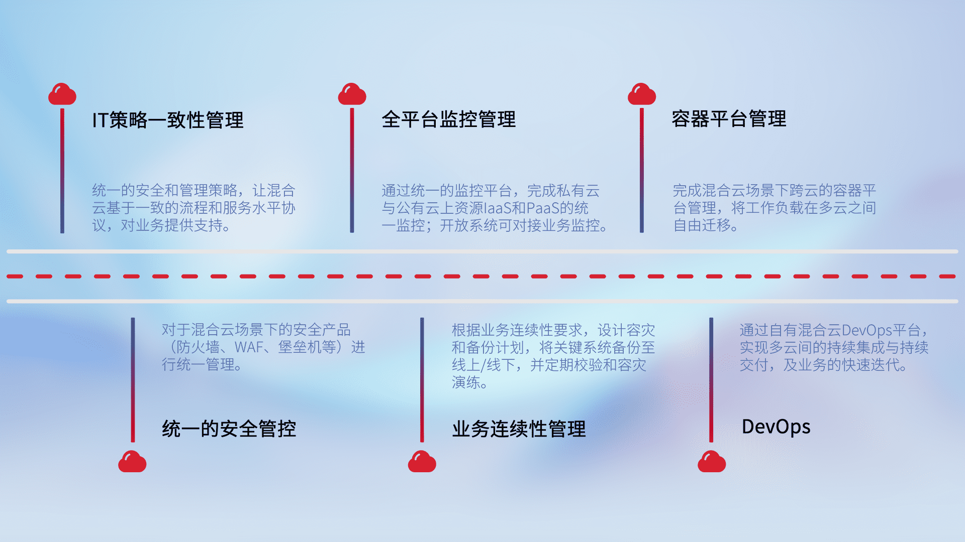 通过多云纳管,,,,以统一的资源数据模型把客户的云资源进行抽象和封装,,,,进而实现对多云资源的统一操作,,保障云资源管理的可靠性、、、、稳定性与可用性。。量身定制化运维内容,,,配置、、、开发运维、、、补丁管理、、、备份、、、、监控、、、、认证和访问管理、、审计和日常巡检等,,保障在用云过程中的可靠度,,,稳定度以及高可用率。。。。